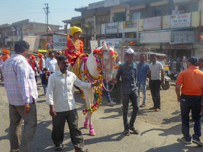Tonight being full-moon, there are festivals in this area related both to the phase of the moon and to a revered maharajah of the past. We encountered one in a town we were passing through, and it pretty much takes over the town, shuts down the main street to trucks and buses, and makes lots of noise with the parade. There was a big festival tonight in Ajanta too; some of our gang attended and it sounded as if everyone from miles around was packed into the central area. As for us, we ate early enough to get back to the hotel for a display of local dance.